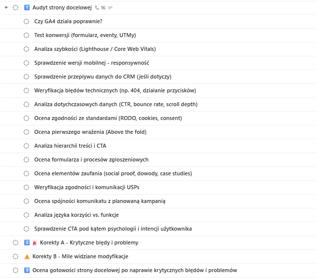 Czy są jakieś działania wstępne (np. audyt konta, analiza lejka)?